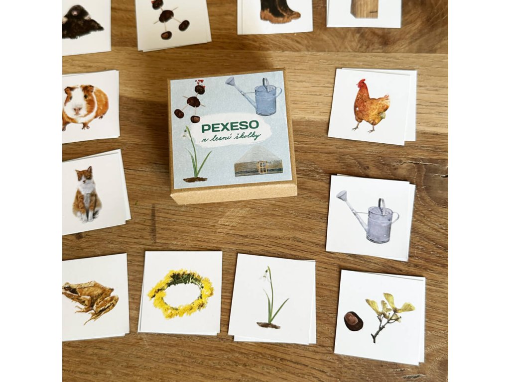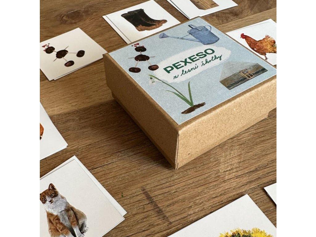 balení obsahuje: 24 dvojic pexesa, vytištěných na křídovém papíru vysoké gramáže. Velikost kartiček je 4,7x4,7cm. Pexeso je již nařezané a uložené v papírové krabičce z recyklovaného papíru.