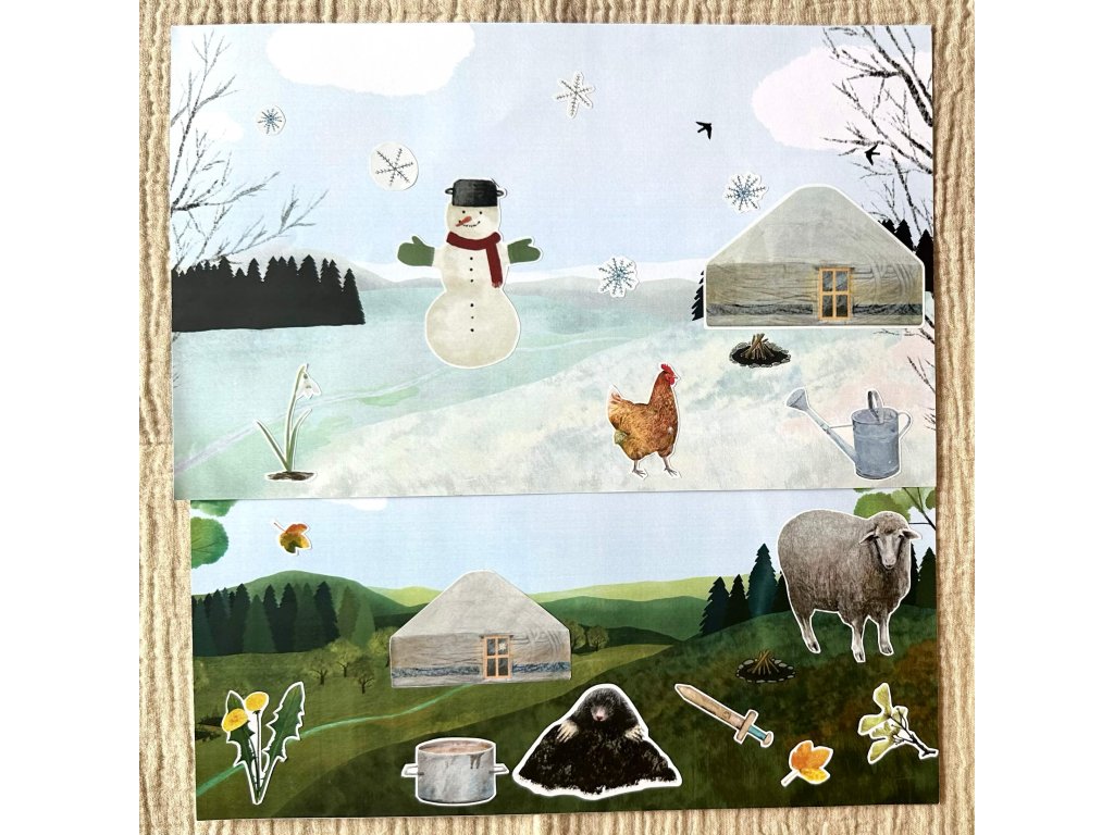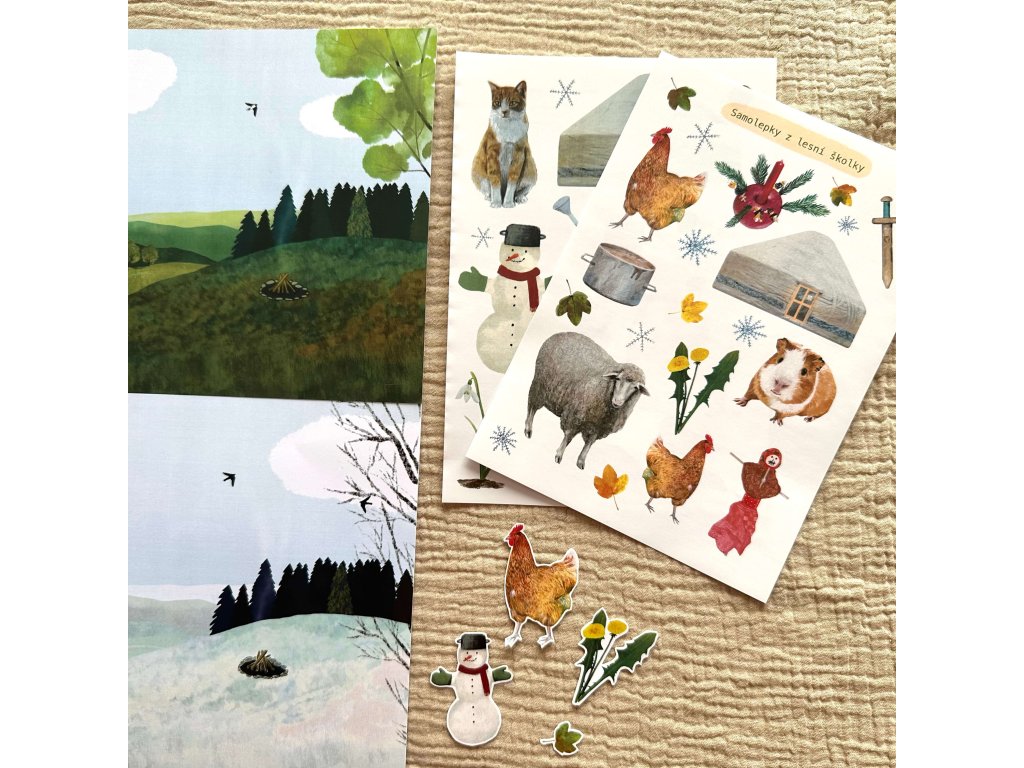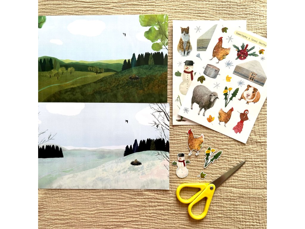 Samolepky, které děti provedou všemi čtyřmi ročními obdobími roku. Užijte si společný tvořivý čas s dětmi, vystřihněte nálepky a ozdobte s nimi dvě předpřipravená pozadí s krajinou. Jurta, krtek, slepice, hrnec bláta a další motivy (nejen) z lesní školky!